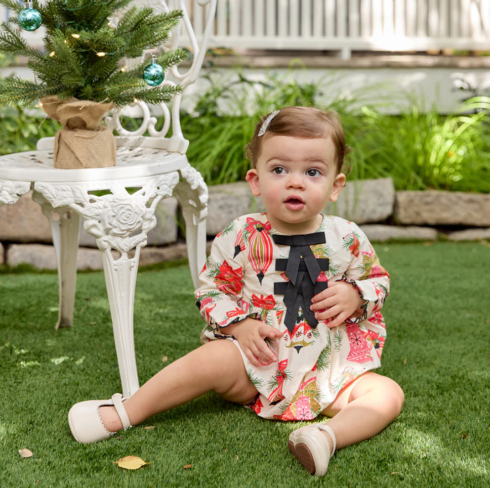 Happy Holly-days! Freshly clipped sprigs of holly tied to vintage ornaments and bells bring christmas cheer to our party-ready Baby Girls Hermione Bubble. This sweet one-piece is adorned with sophisticated black grosgrain ribbon bow accents at the chest, black pearl stitch ruffled trim at the gathered cuff and has an invisible zipper closure at the back. Ring snaps at the legs allow for easy diapering. Twin with Big Sis in our Girls Hermione Dress.