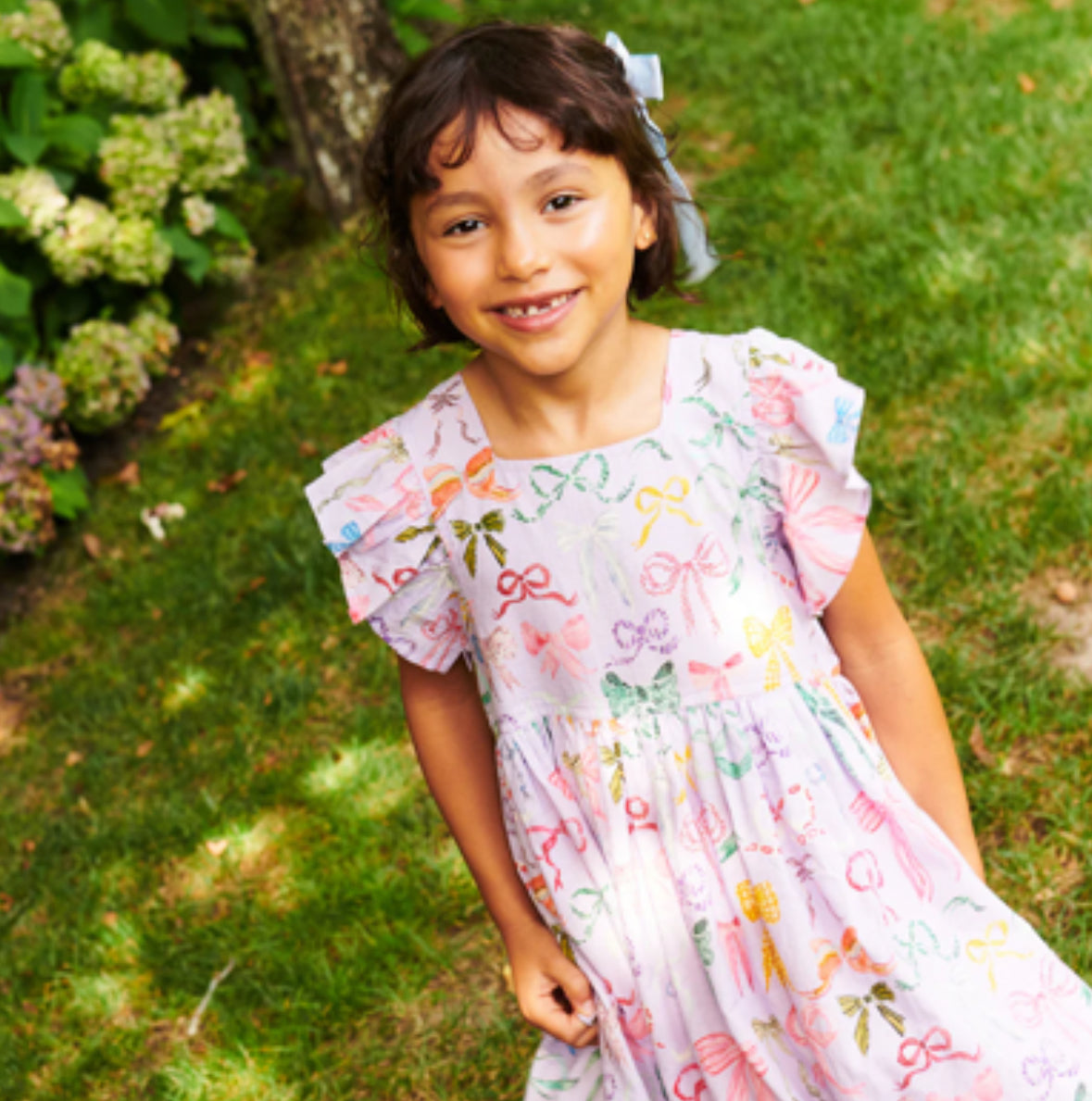 A Bounty Of Bows! A colorful array of ribbons and bows, courtesy of one of our favorite artists Tara Roma Gill, comes to life against a light purple canvas in her lively Lavender Watercolor Bows, shown here on our flock favorite Girls Elsie Dress. Designer details include a square neckline, soft ruffle sleeve and fully gathered skirt. You'll find our signature glitter button closure at the back. Match back to Sister in our Girls Eleven Jumper and Baby Girls Jaipur 2-piece Set.